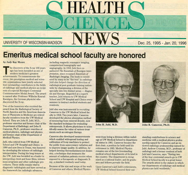 John Juhl, MD and John Cameron, PhD were awarded the special Roentgen Centennial Commemorative Medal Award from the Radiological Society of North America (RSNA) and the American Association of Physicists in Medicine (AAPM) for their numerous early groundbreaking contributions to the field of radiology.